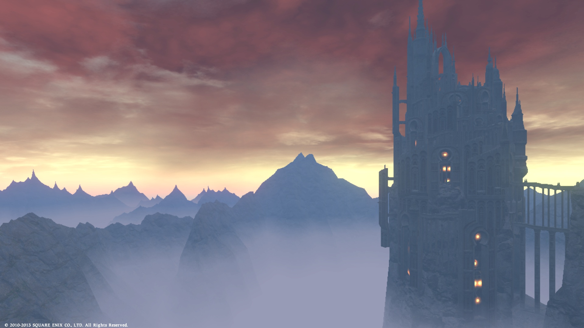 ここからはエーテリアルゲート「帝龍泊」(だったかな・・?)から眺めるイシュガルドとアバラシア山脈、日付が変わるころにちょうど夜明けの撮影に成功。