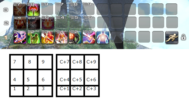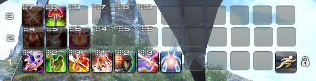 これも個人の設定方法やスタイルによりますが、自分はバフに関係するアクションや、毎回戦闘のたびに使うアクション以外を横ホットバー1~3に配置しています。